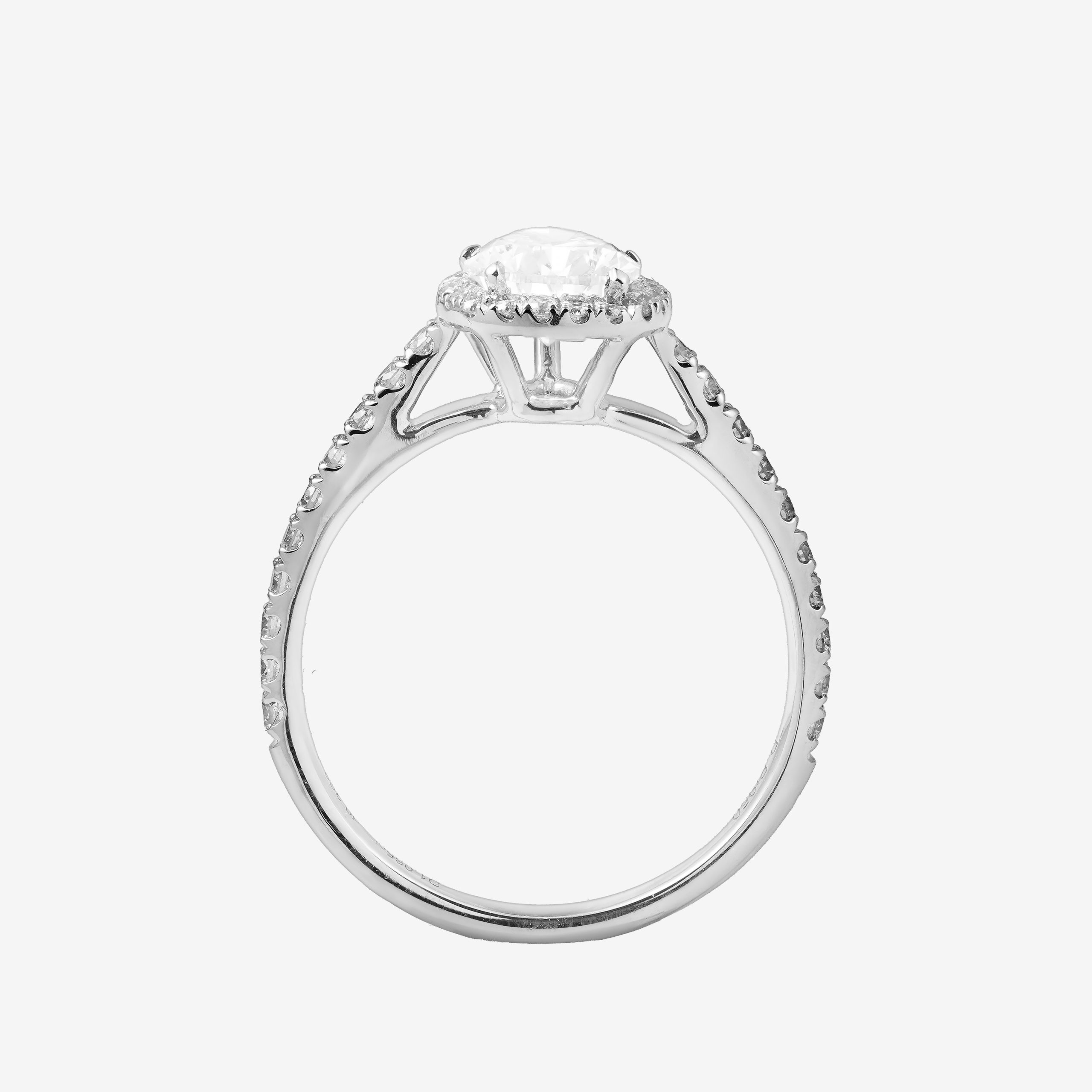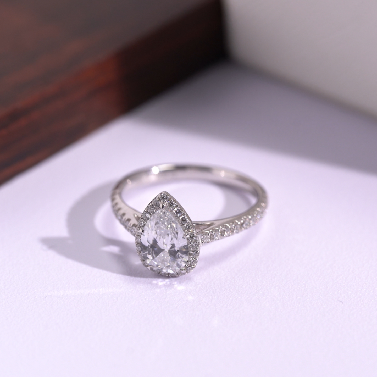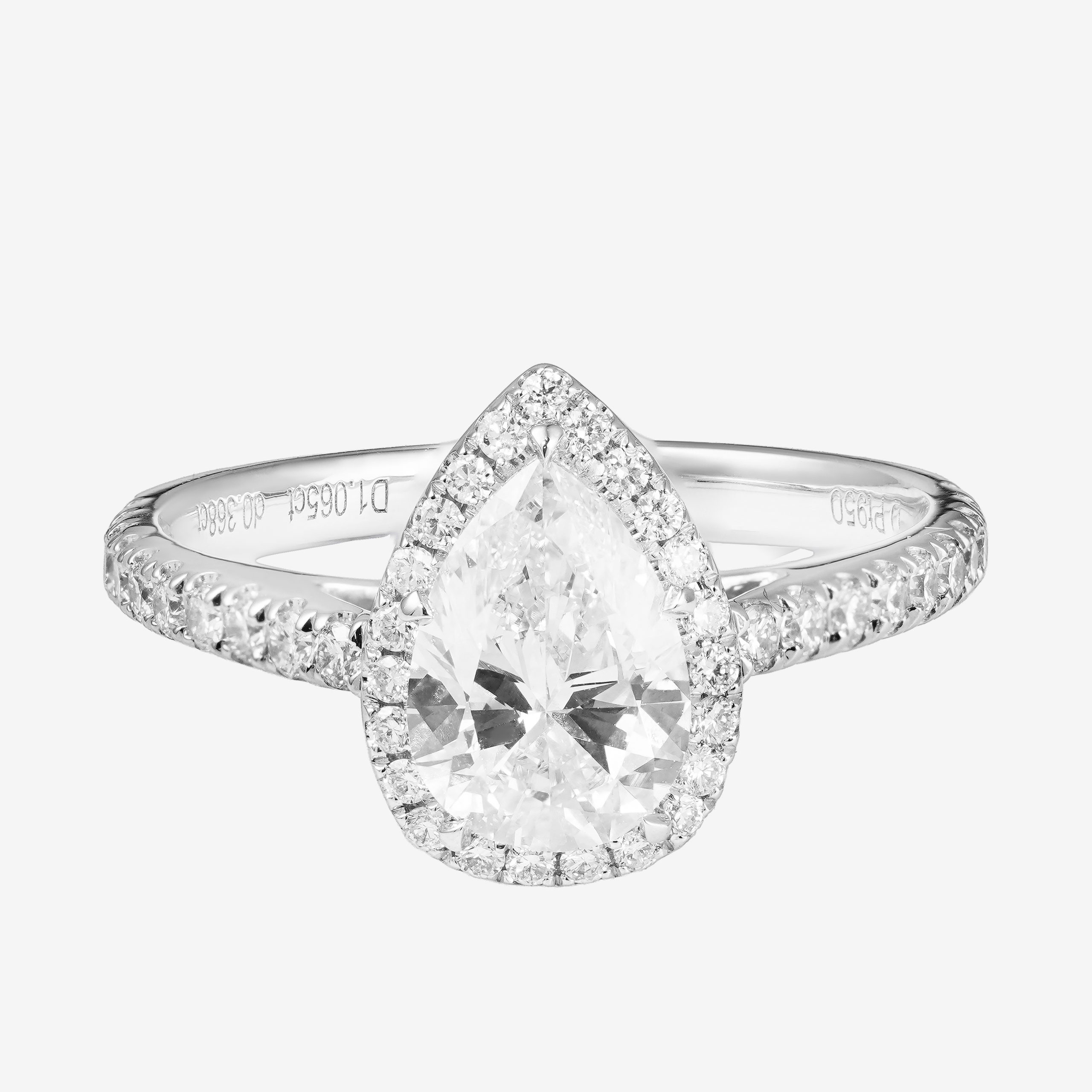 A timeless symbol of love, this pear-shaped diamond ring features a dazzling center stone encircled by a halo of diamonds, crafted in platinum for a touch of elegance.