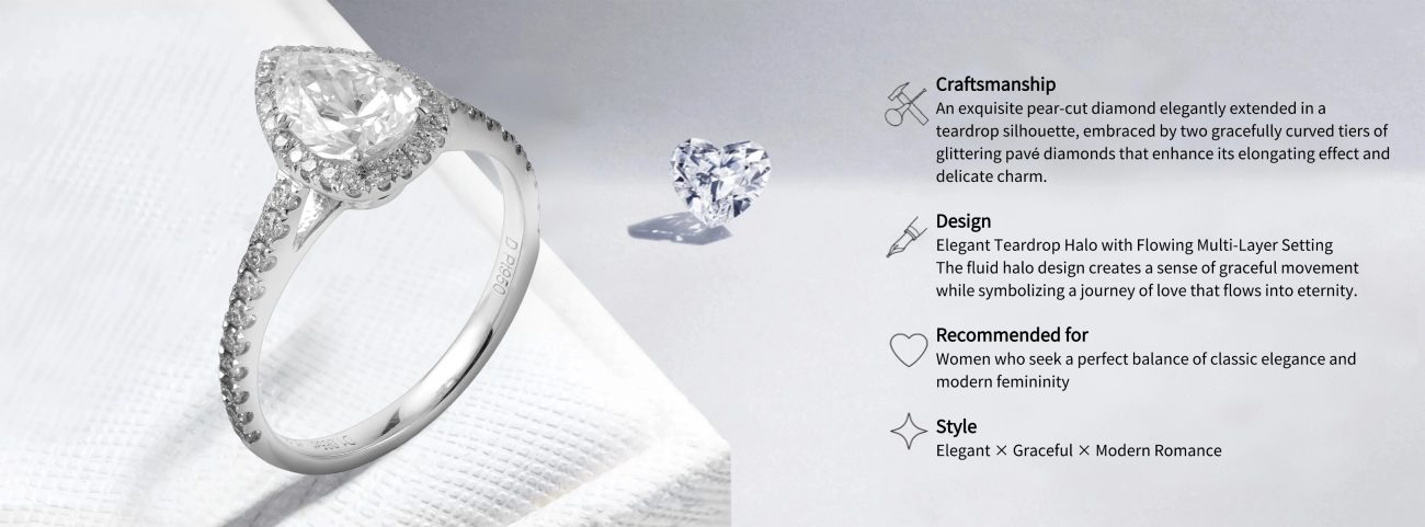 The “Eternal Drop” captures the essence of timeless love. Its stunning pear-shaped diamond is embraced by a halo of sparkling diamonds, symbolizing the infinite beauty and depth of true commitment. Crafted in platinum, this piece reflects the elegance and enduring nature of love—precious, radiant, and forever enduring. A perfect symbol of love’s lasting promise, this ring is meant to be worn through every chapter of your journey together, from the first meeting to a lifetime of shared moments.