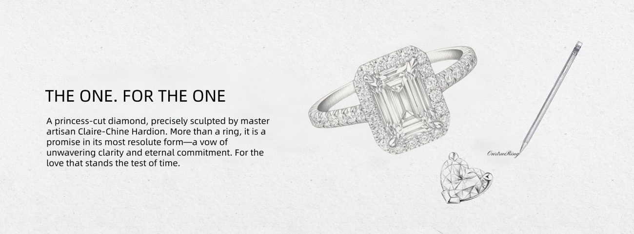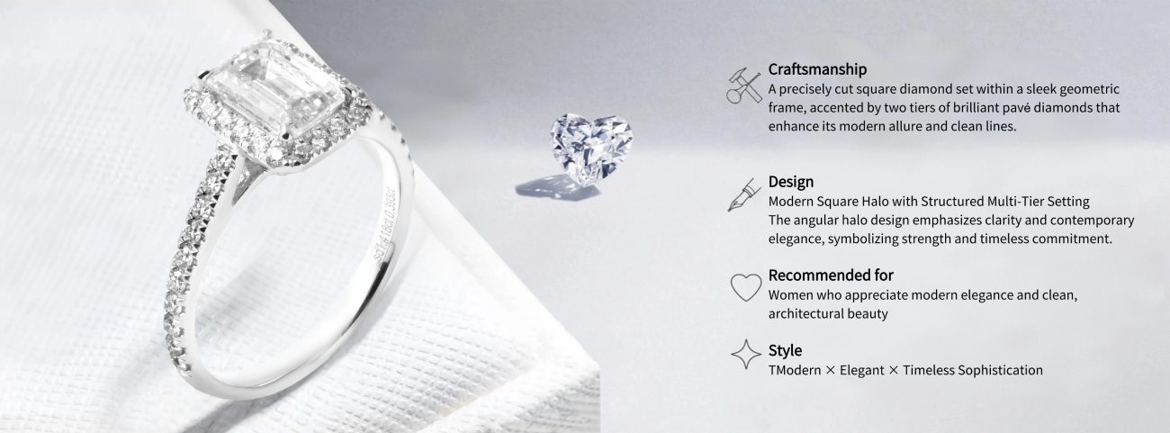 Embodying the strength and precision of love, ‘Love Cube’ showcases a beautifully crafted emerald-cut diamond, surrounded by a delicate pavé halo. Its clean lines and geometric elegance mirror the unwavering, timeless bond between two hearts