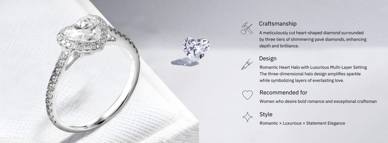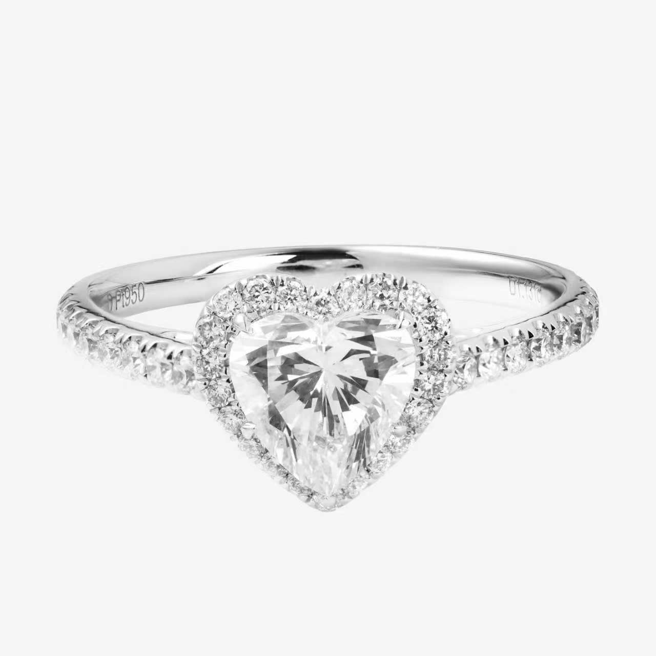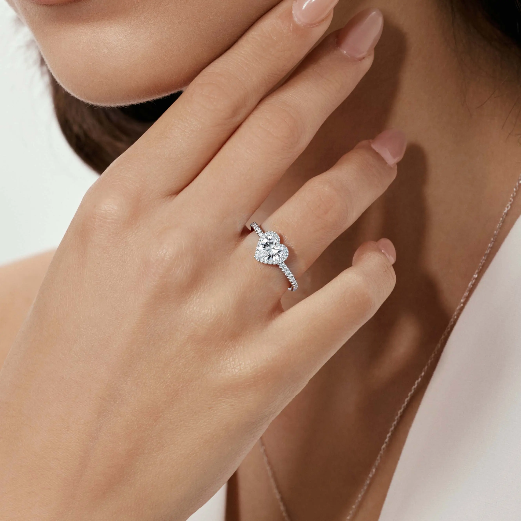The Love’s Aspiration ring symbolizes the purest and most passionate of connections. Its heart-shaped diamond represents the deepest emotions, encapsulating love that aspires to last forever. Adorned with a delicate pavé halo, this ring embodies the dream of eternal love, a bond that grows stronger with every passing moment.